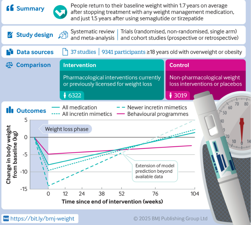 A tanulmány megállapította, hogy a visszahízás négyszer olyan gyorsan következik be a gyógyszeres kezelést abbahagyását követően, mint amikor valaki egy viselkedésalapú életmódprogramot (pl. diéta és testmozgás) fejez be, méghozzá attól függetlenül, hogy mennyi súlyt vesztettek korábban.